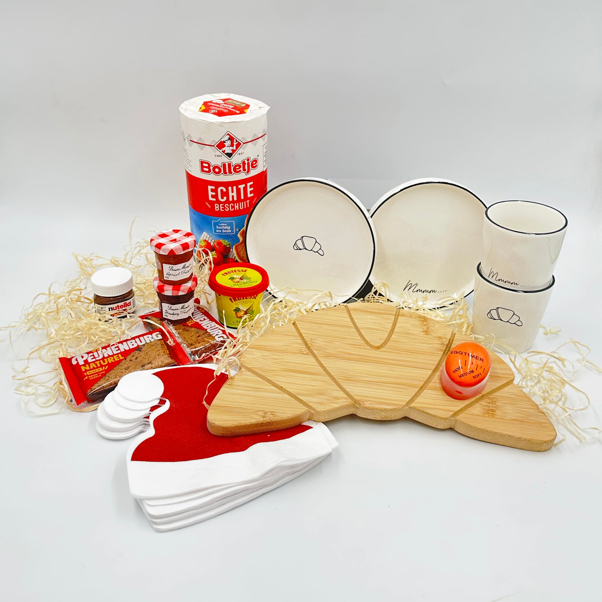 Start de dag goed met ons Goedemorgen-pakket. Vol zoete lekkernijen om samen van te smullen. Perfect voor een (kerst)ontbijt op bed of om gewoon extra van je ochtend te genieten. Je serveert jouw ontbijtje op een charmant servies en plank in croissant stijl.